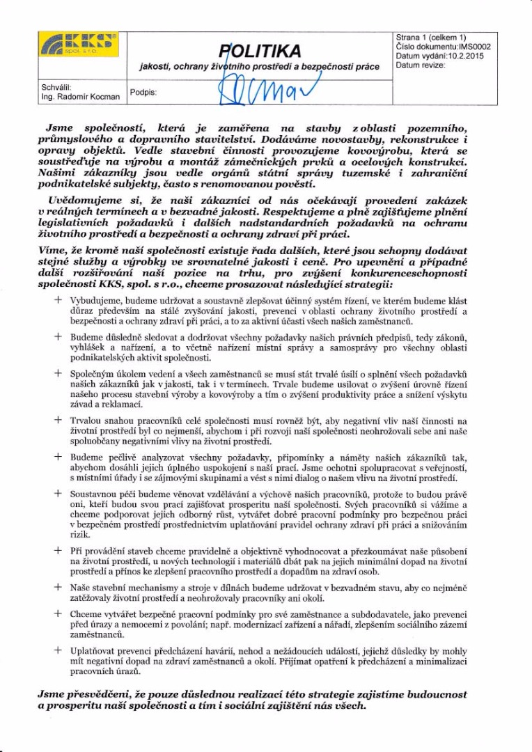 Společnost KKS, spol. s r.o. zavedla a používá od roku 2009 integrovaný systém řízení, jehož součástí je: