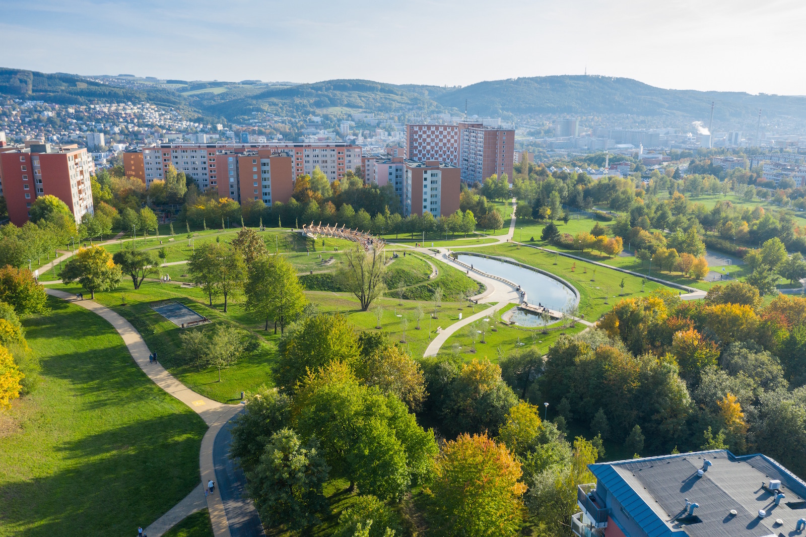 Parkové úpravy plochy včetně vybavenosti pro rekreační pohybové aktivity a pro využití srážkové vody pro zlepšení mikroklimatu území.
