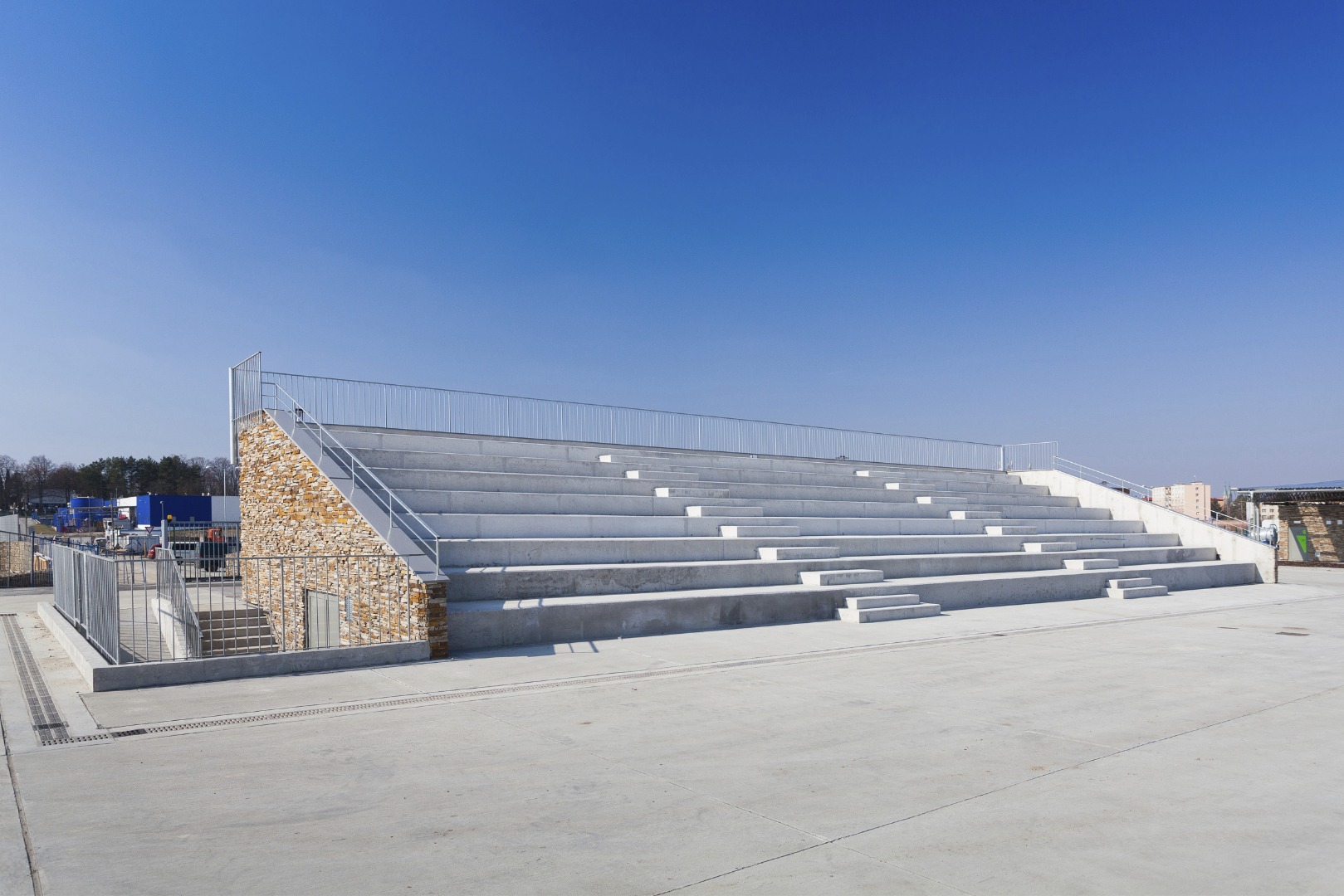 Venkovní posezení - krytá terasa s provozním objektem s kuchyní a výčepem, hlediště pro sedící diváky, dětské hřiště, moravská zahrada, provedena zpevněná betonová plocha a výstavba parkoviště pro osobní automobily.