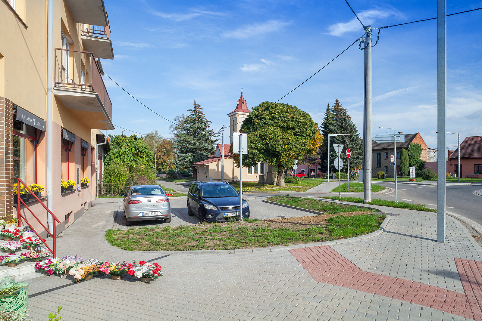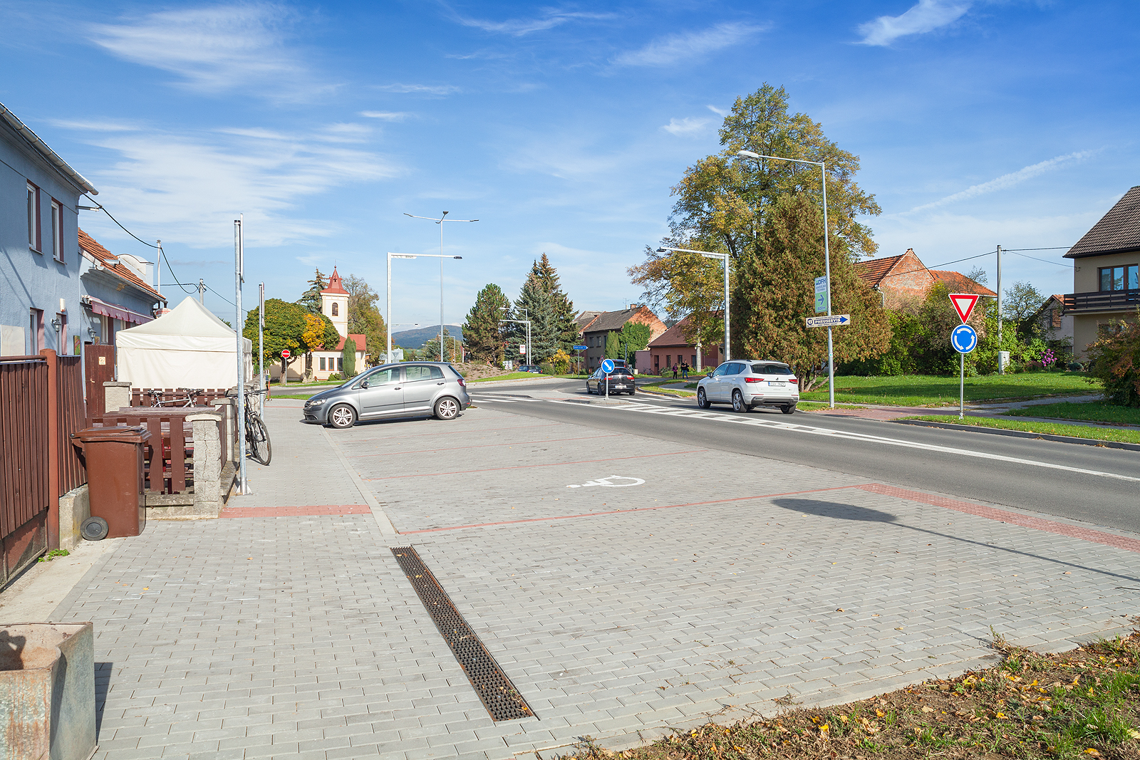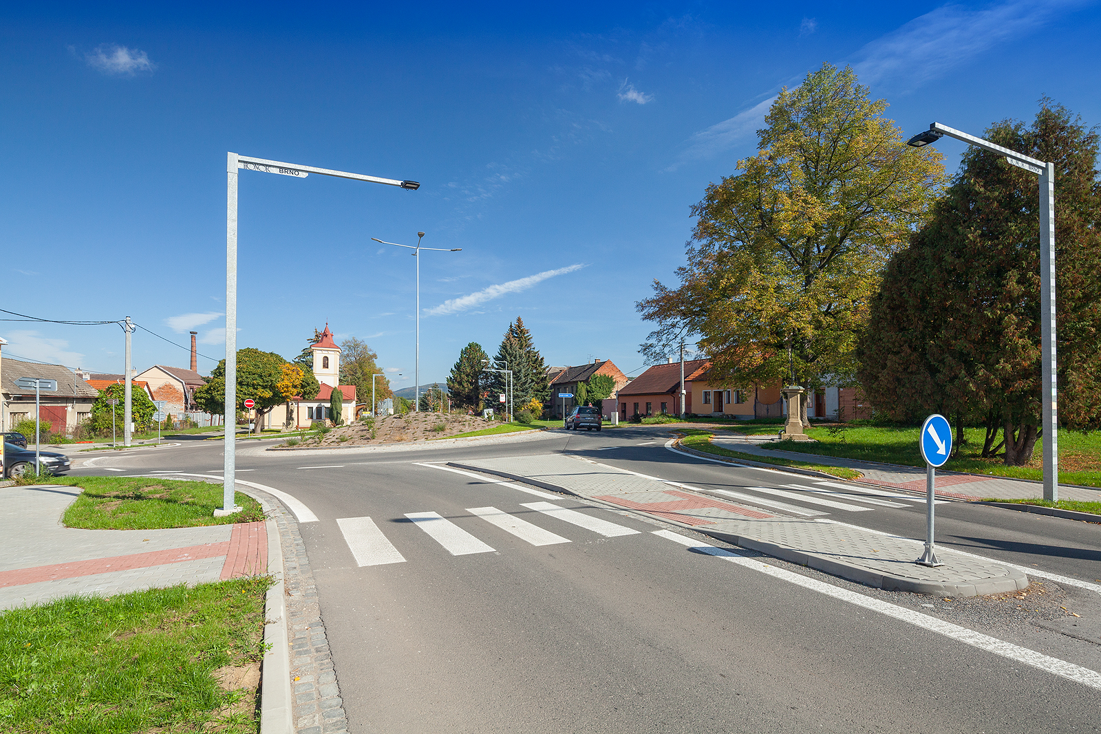 Přestavba stávající styčné křižovatky na okružní křižovatku, napojení místní komunikace a sjezdu k rodinným domům.
